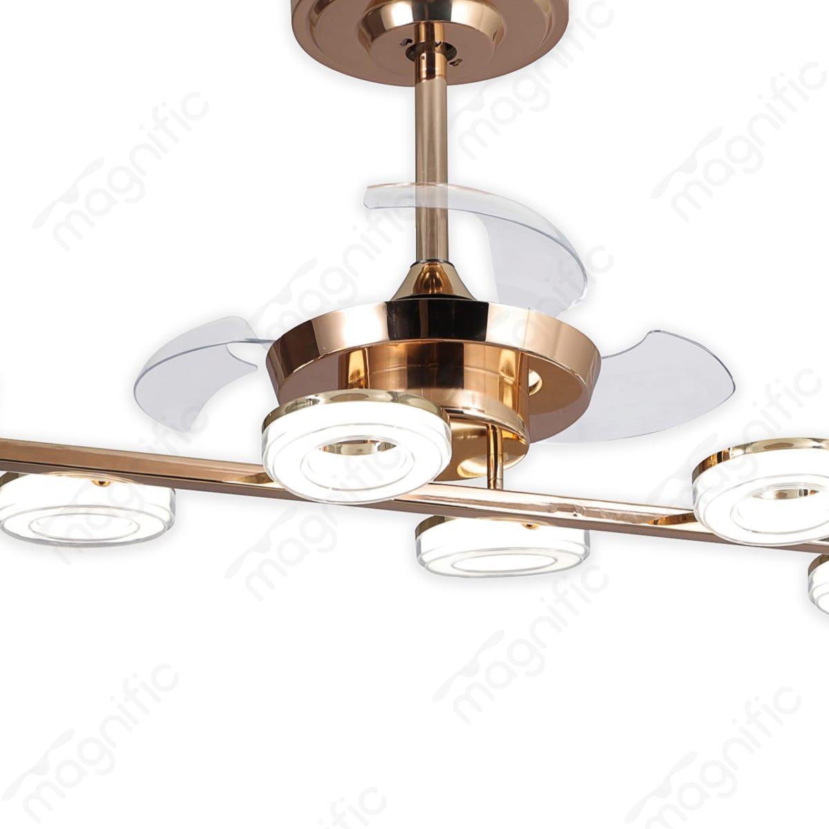 The Arum ceiling fan from Magnific Designer Fans is a striking blend of form and function, serving as both a cooling solution and a captivating piece of modern art. Its unique design, featuring a French gold finish and transparent blades, makes it a true statement piece for contemporary interiors.