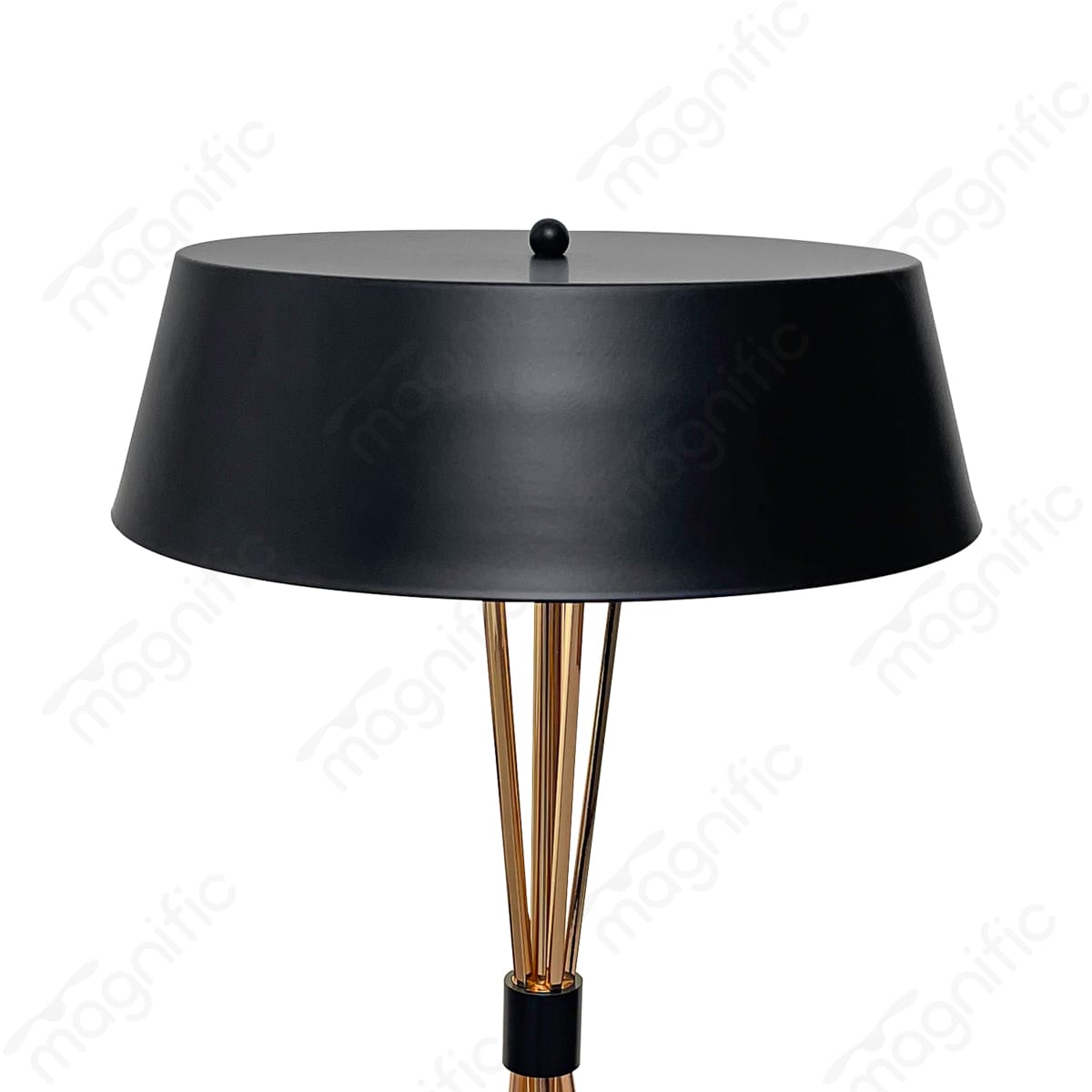 The modern design and timeless luxury with this exquisite black and gold table lamp. The lamp features a captivating design, with a gleaming gold base that cradles a sleek black globe shade. This lamp transcends mere functionality, becoming a conversation starter with its unique and eye-catching design.