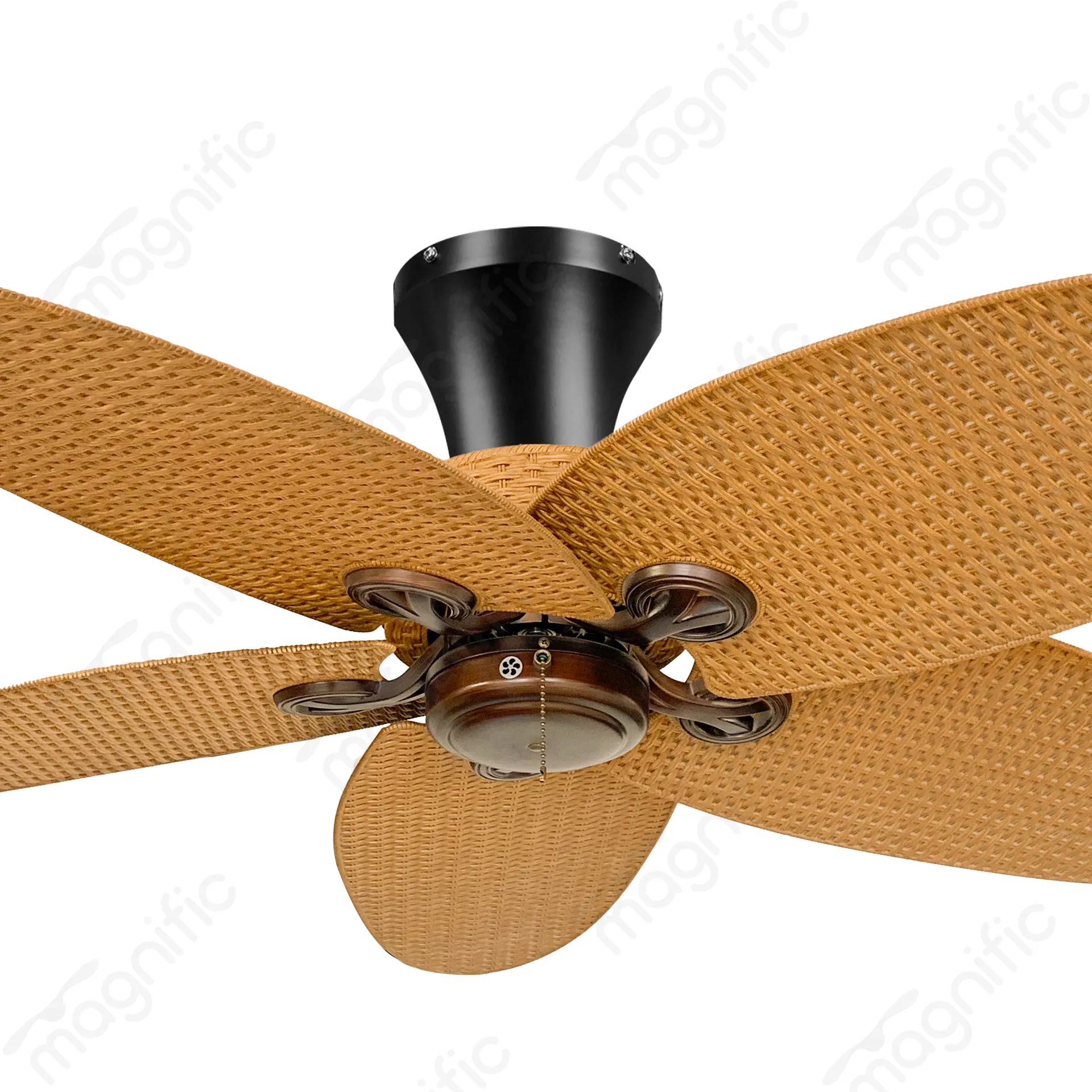 The Magnific Classic Hugger by Magnific is a stylish, low-profile ceiling fan featuring natural 5-petal rattan blades. Ideal for bedrooms, patios, and sunrooms with low ceilings. Available in Rattan Brown, Grey, and White.