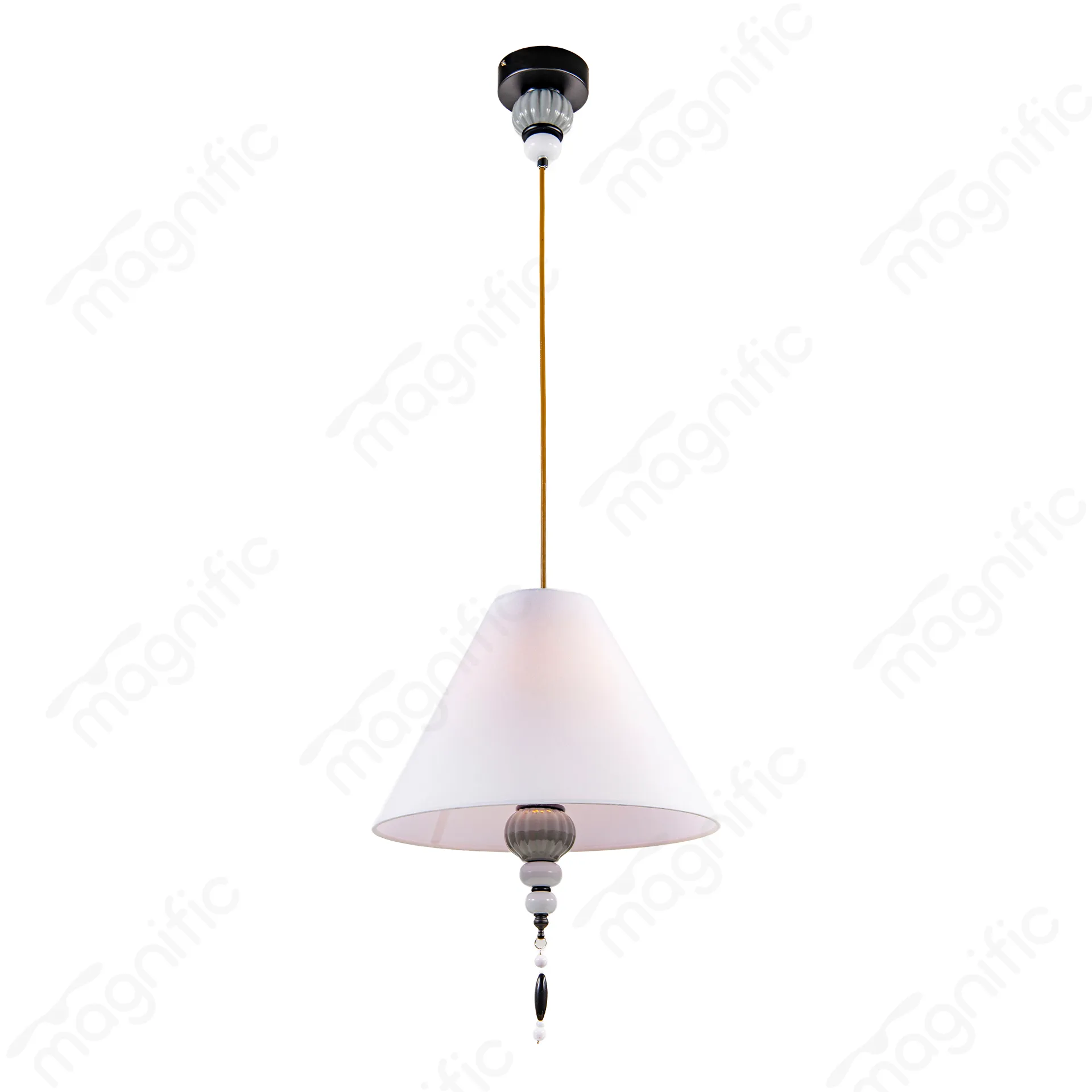 This Magnific modern pendant light features a beautiful white shade with sleek matte black and grey accents. It uses a standard E27 bulb for customizable lighting.