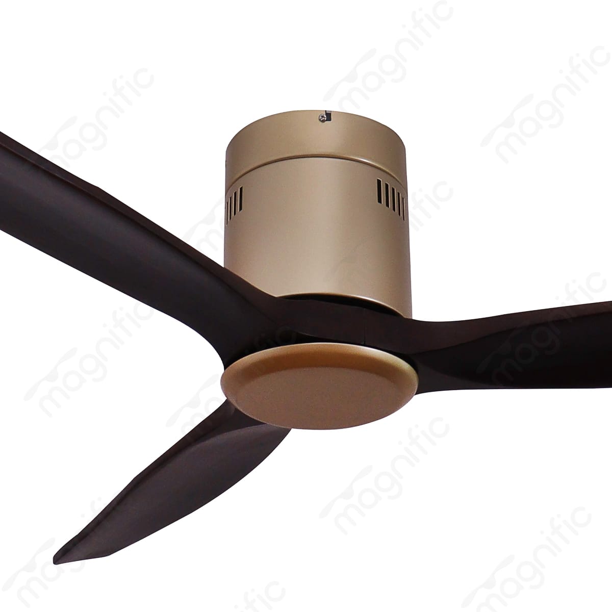 Magnific Cosmo is the perfect solution for rooms with low ceilings, offering both style and function. Its elegant design boasts with solid wooden blades and a minimalist matte gold finish body, adding a touch of modern sophistication to any space.