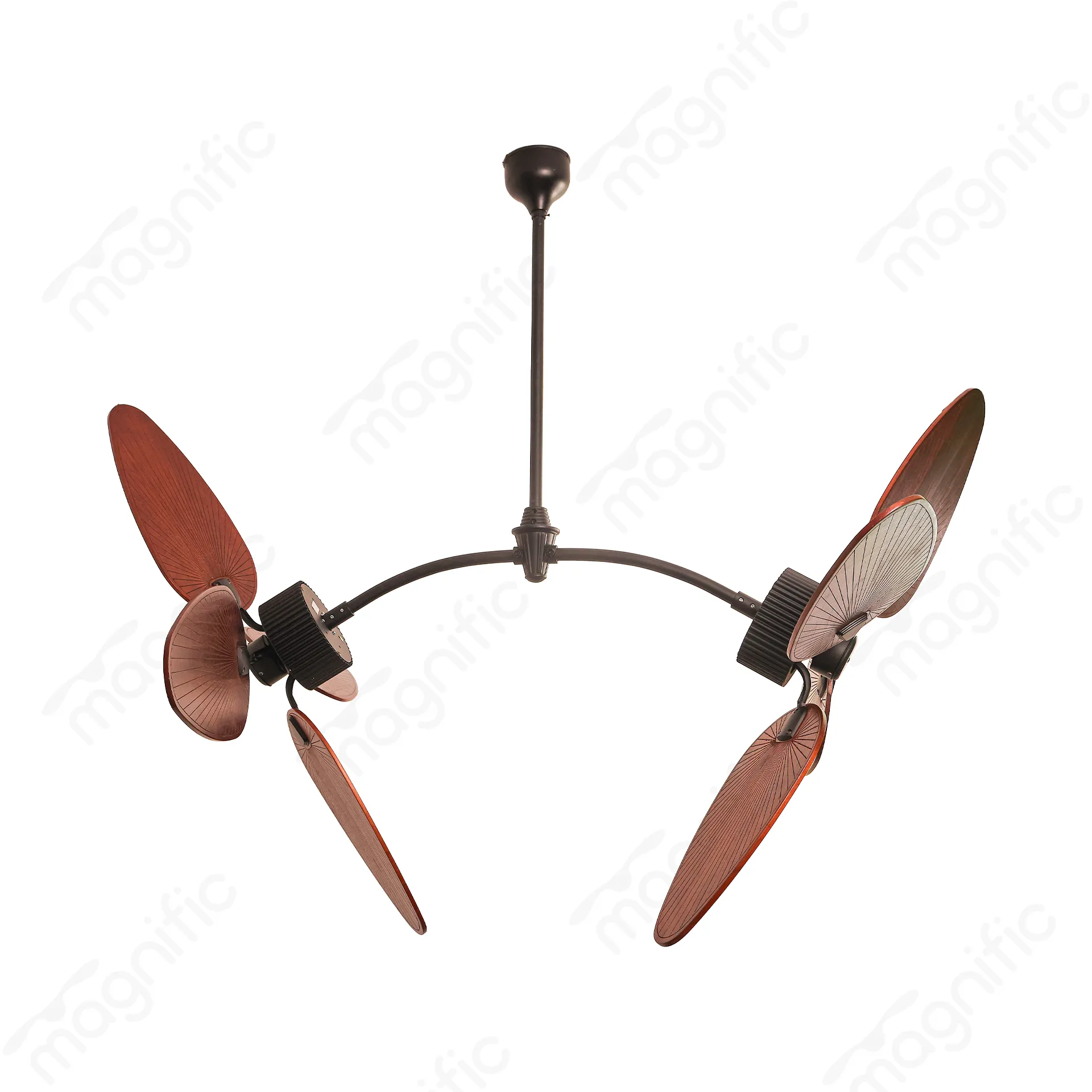 Elevate your interior design with the Magnific Dual, a show-stopping ceiling fan designed for high-ceilinged spaces. This unique fan boasts two 52-inch fan units, each equipped with Four handcrafted Dark wooden blades, creating a visually stunning centerpiece that complements  industrial, or eclectic décor.
