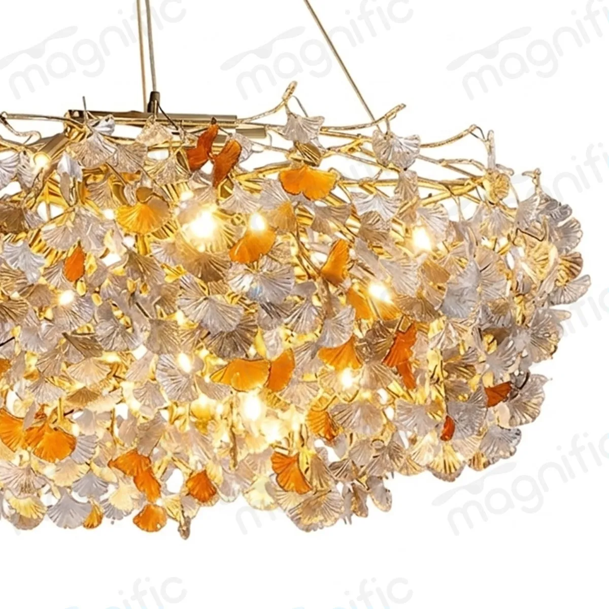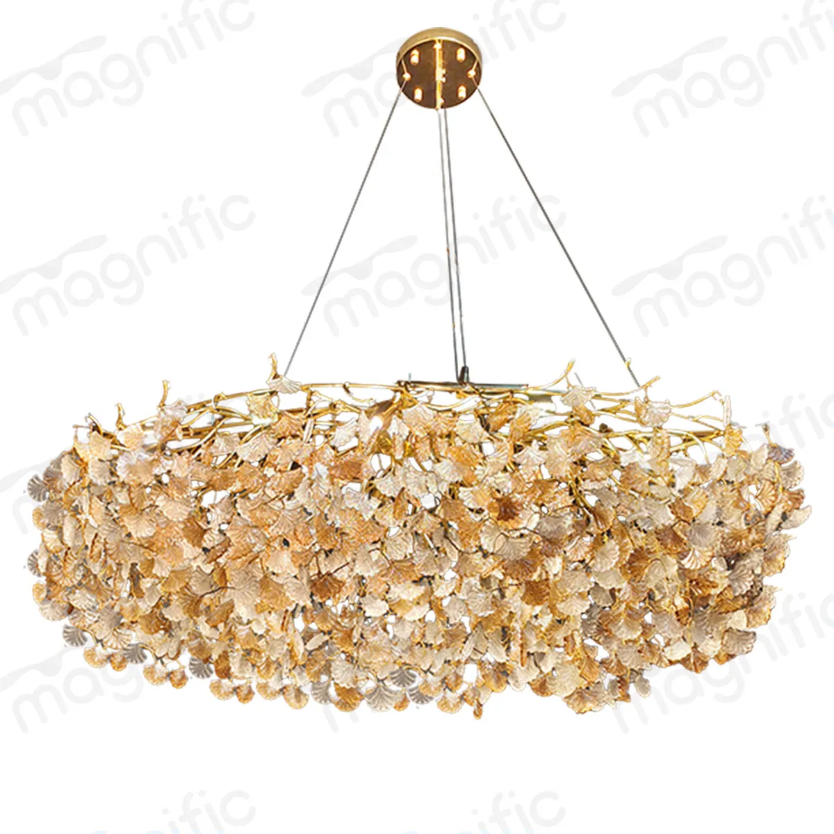 The Floral Petal Ring Chandelier is the grandest and most architecturally considered expression of Magnific floral petal design language. At 1200mm in diameter, its open circular ring form is densely encrusted with individually set champagne and gold petal elements ginkgo leaf-inspired in their delicate fan shape that wrap the full circumference of the ring body in an unbroken garland of golden botanical detail.