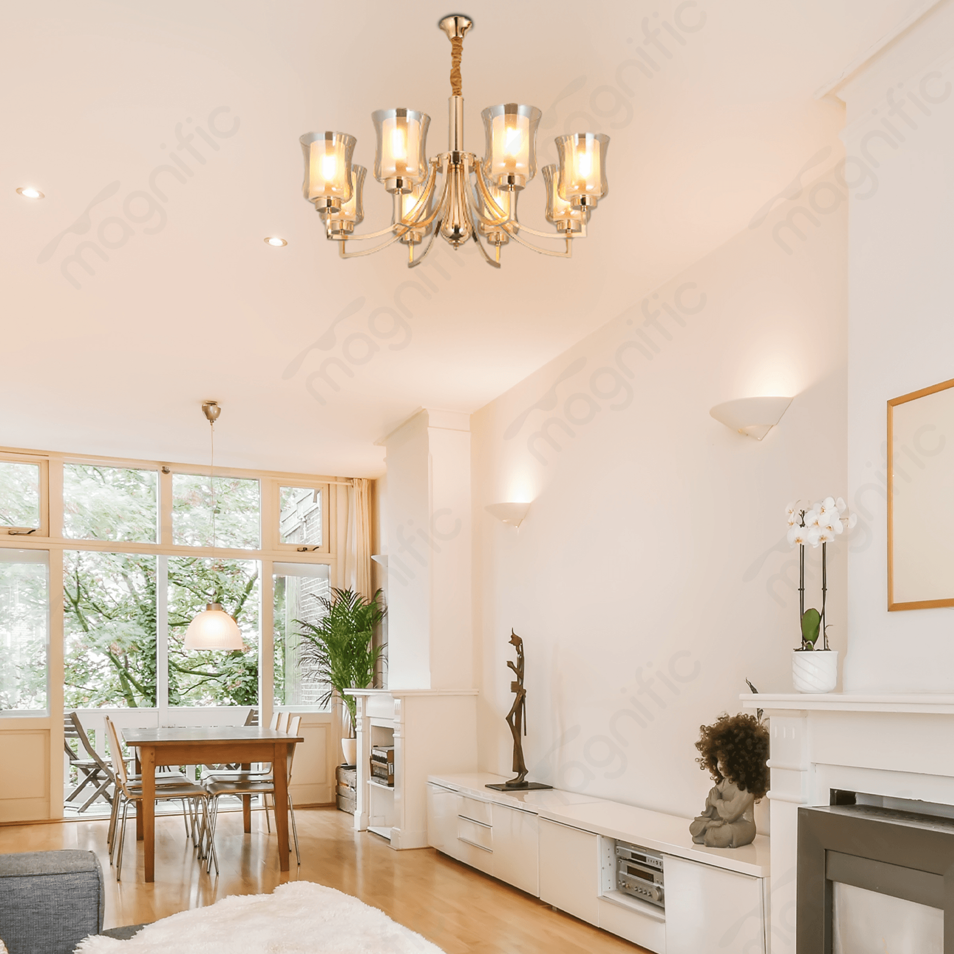 The eight E27 bulbs cast a warm and inviting glow, creating a cozy atmosphere for intimate gatherings. This chandelier strikes the perfect balance between function and form. While providing ample light, the cascading crystals elevate the experience to a new level of luxury. They are meticulously crafted to ensure lasting brilliance and dazzling light dispersion, even after years of use.