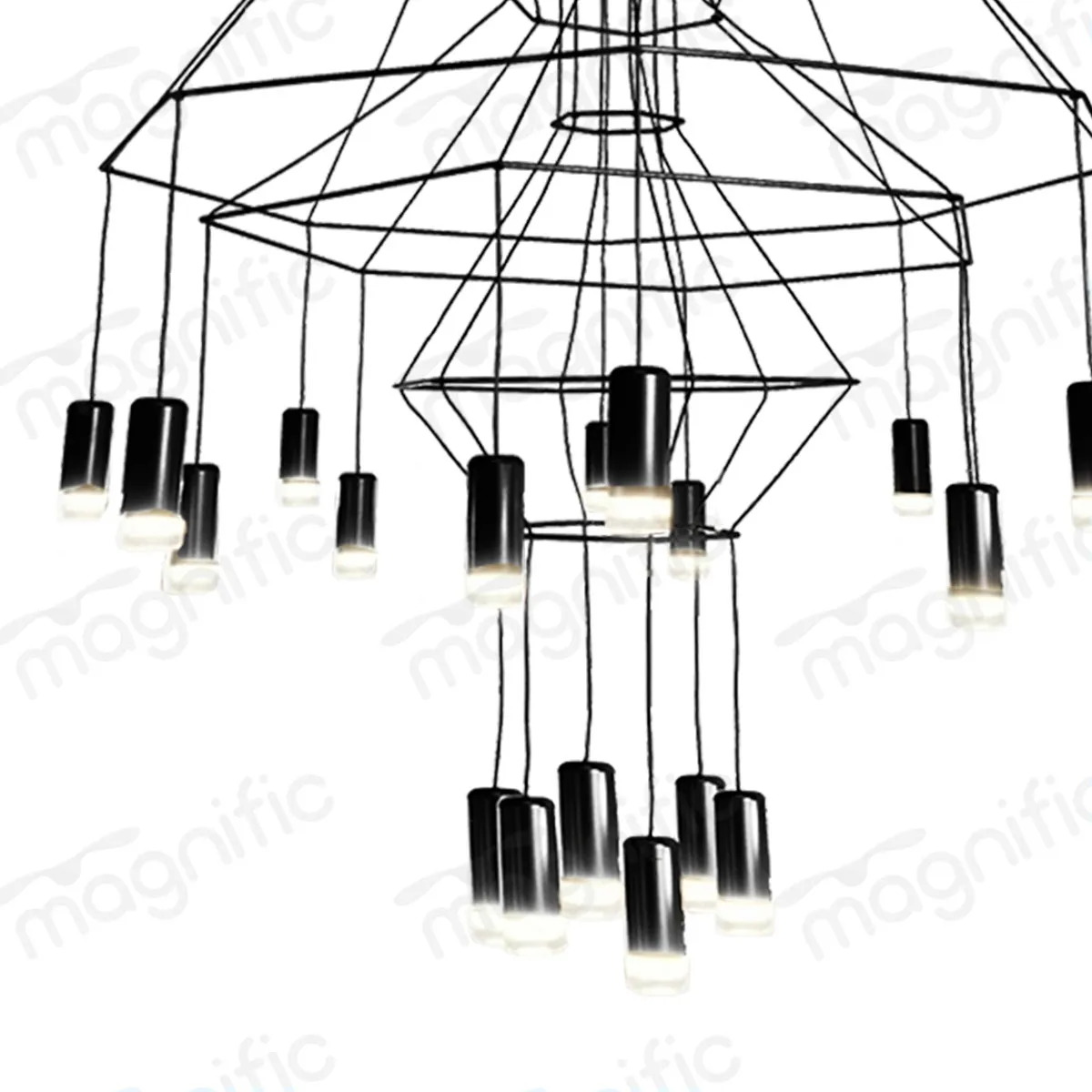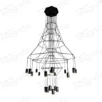 Twenty individually suspended LED pendant heads – each rated at 3W – hang at calibrated heights across the fixture’s three tiers, creating a rhythm of light and negative space that is as considered as any custom installation. In matte black, the wireframe nearly disappears against dark ceilings, allowing the warm glow of each pendant head to float independently, as if suspended by invisible threads.