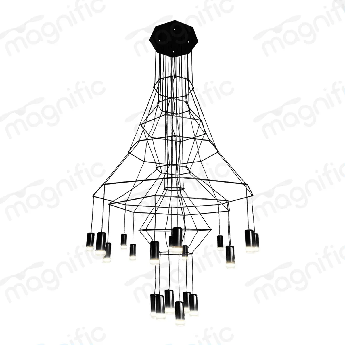 The Apex Geometric Multi-Pendant Chandelier is Magnific definitive statement for the design-forward home. Spanning 1200mm in diameter and descending 2200mm (approx. 47″ wide × 86″ tall), its structural wireframe is built around stacked geometric rings – hexagonal, triangular, and circular – that taper from a wide octagonal ceiling canopy into a composed, almost architectural pyramid of light.