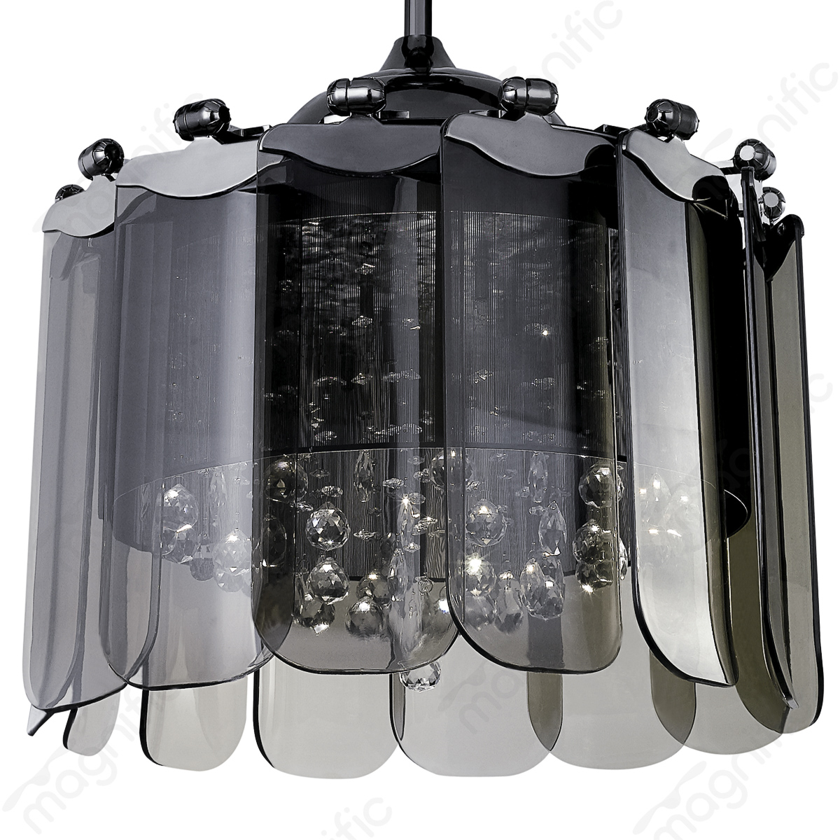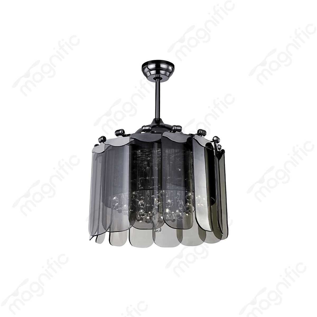 The powerful airflow with the Magnific Grace ceiling fan. This modern fan features 14 captivating transparent blades, a sleek gun metal finish, and offers 6-speed control, a remote control, and a 4000k LED light.