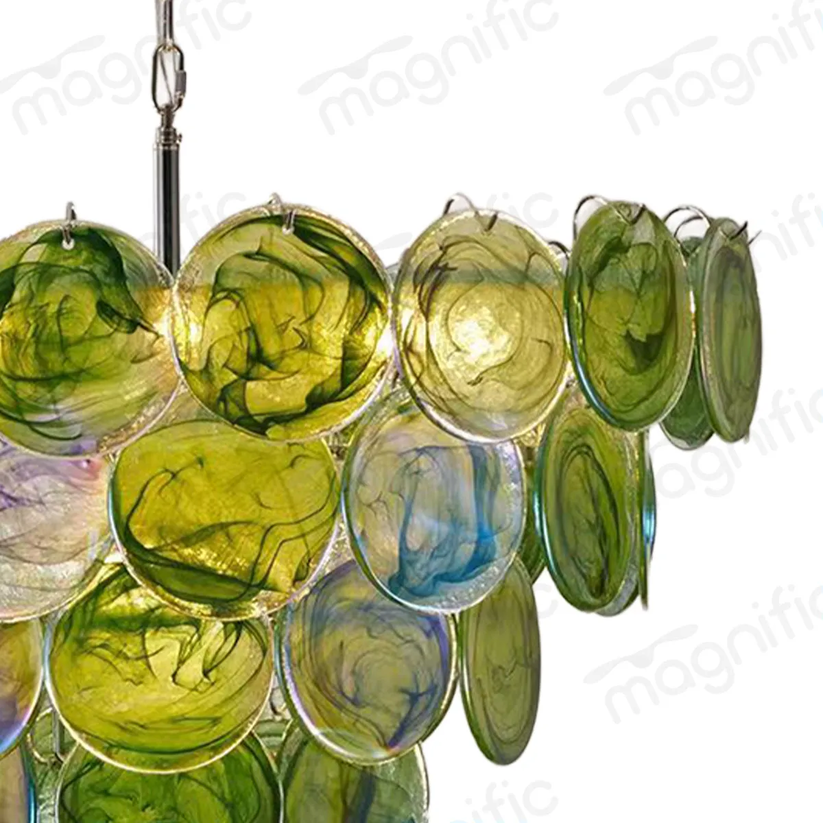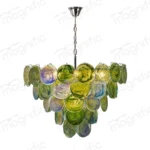The Soleil Vert is the larger, bolder, and more jewel-toned expression of Magnific iridescent glass disc family. At 800mm in diameter a full 200mm wider than the Soleil Amber it presents a deeper, more voluminous tiered disc canopy that fills the ceiling plane with a generous sweep of overlapping glass in emerald, sage, olive, and violet-tinged iridescent tones.