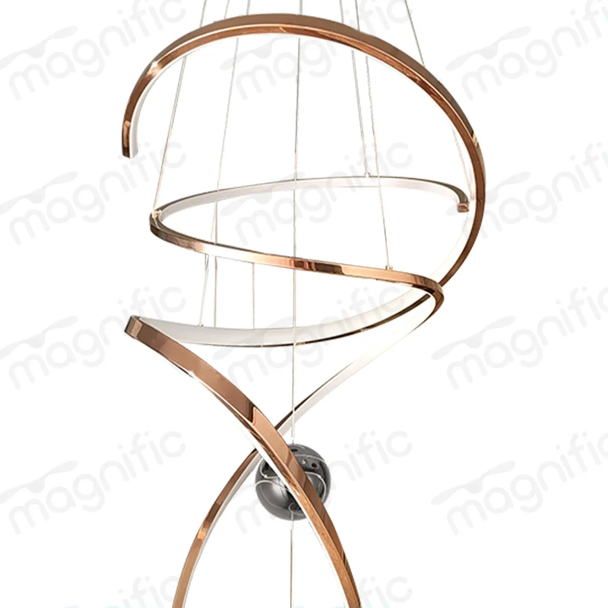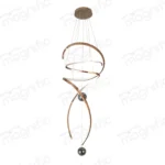 The Helix Spiral Pendant is unlike any other fixture in Magnific collection – and intentionally so. While most pendant chandeliers inhabit horizontal space, the Helix is conceived as a vertical composition a 1300mm (approx. 51″) tall cascade of interlocking rings, spiralling ribbon arcs, and a polished sphere terminus that descends from a compact 450mm (approx. 18″) diameter ceiling canopy in a single, unbroken sculptural movement.