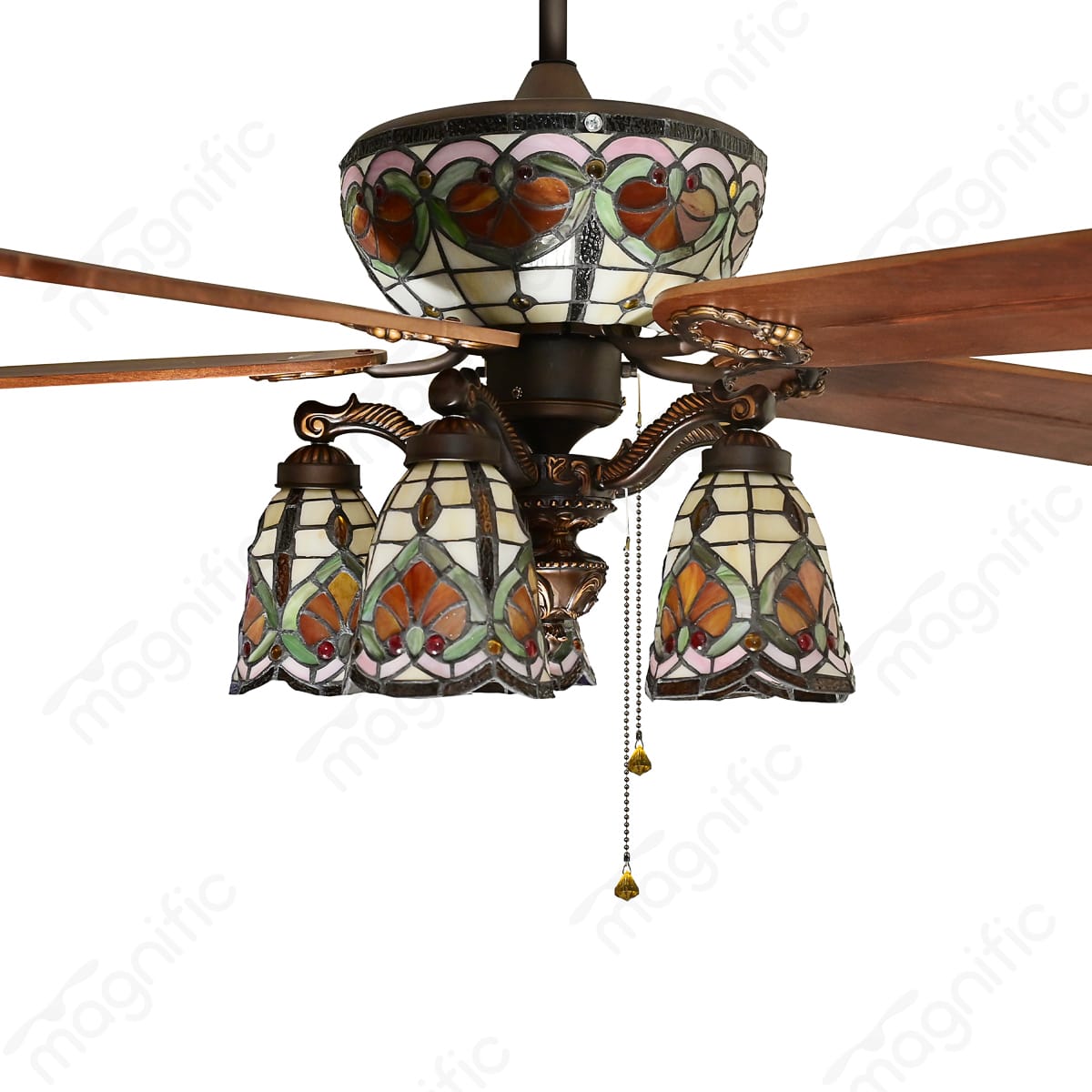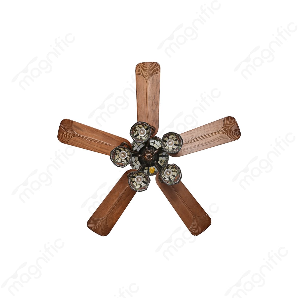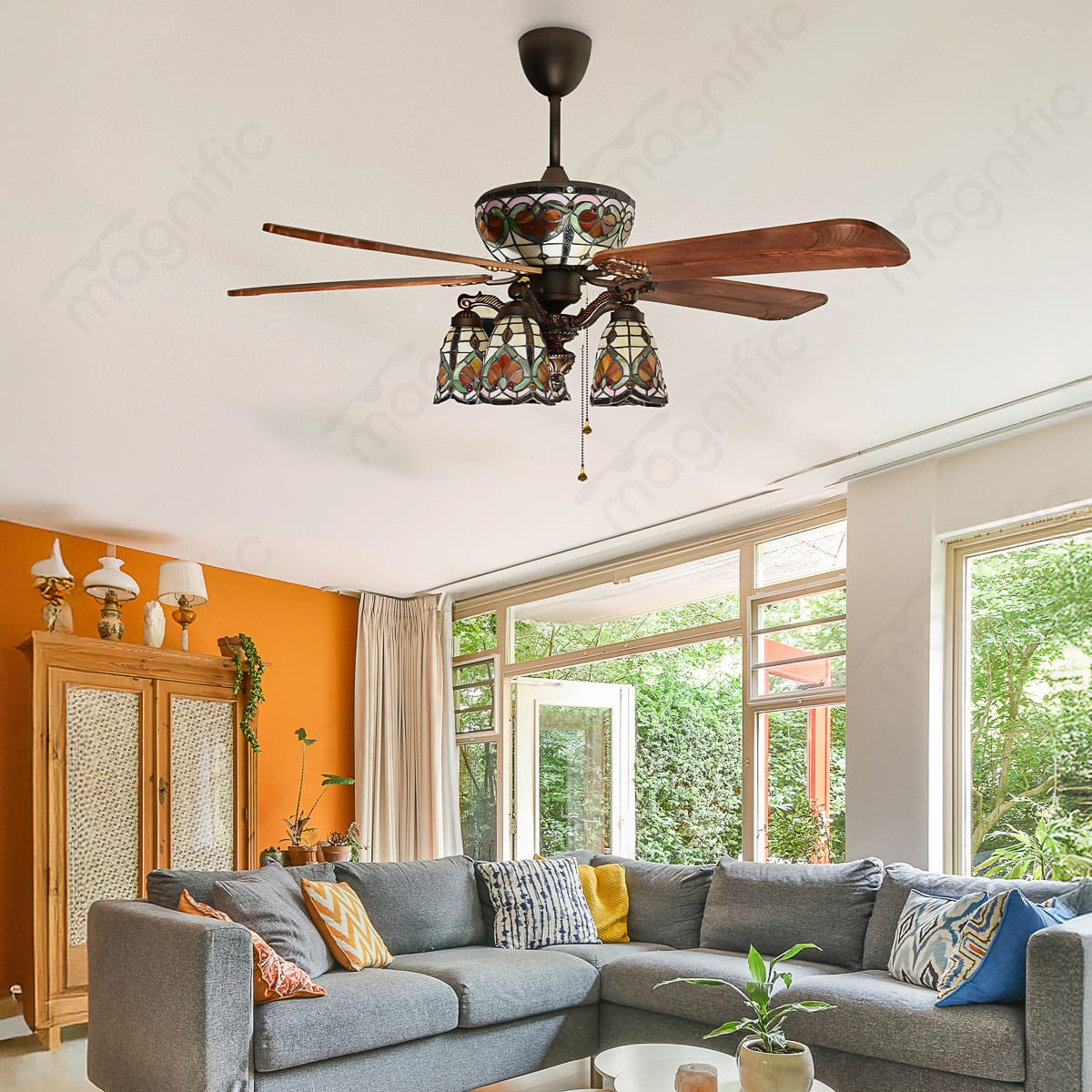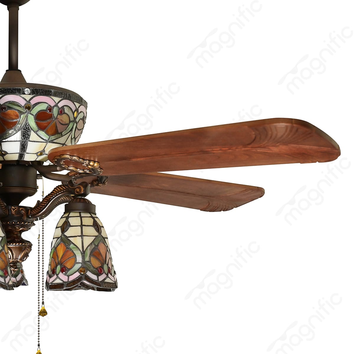 Magnific Isla brings a touch of vintage charm and artistic flair to your home. This stunning 52-inch ceiling fan features hand-crafted wooden blades and a beautiful hand-painted stained glass with tiffany design light kit that creates a warm and inviting ambiance. Isla’s vintage classic design complements a variety of décor styles, especially Mission, Bungalow, and Arts & Crafts. The powerful AC motor delivers airflow up to 7060 CFM, while the summer/winter option keeps you comfortable year-round. A pull cord mechanism provides easy control over fan speed and light settings. Ideal for living rooms, dining rooms, bedrooms, and hallways.