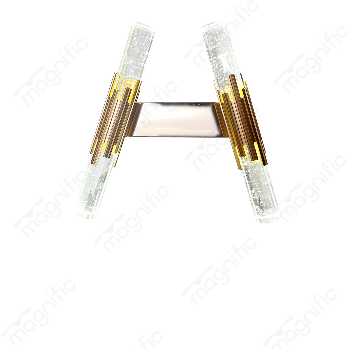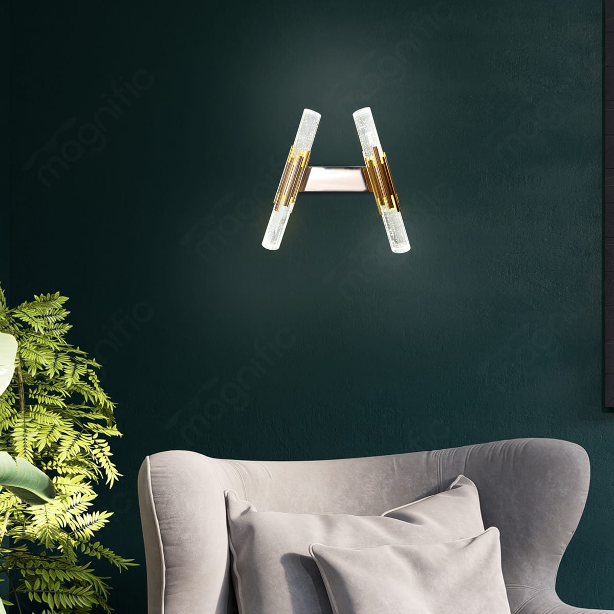 The luxurious gold finish is adorned with sparkling crystals, creating a truly dazzling focal point. This modern wall light features integrated LED bulbs cast a warm, inviting glow.