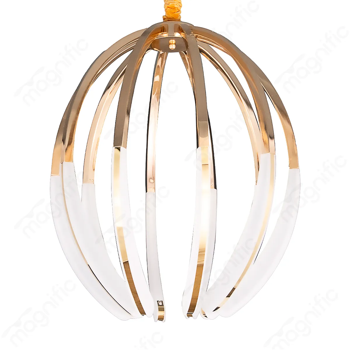 The Magnific Lighting Hanging light offers a captivating blend of modern design and luminous artistry. Its openwork elliptical shade, finished in a luxurious French Gold, creates a sense of lightness and allows the internal 60W LED to shine through the slats, producing a unique and radiant glow.