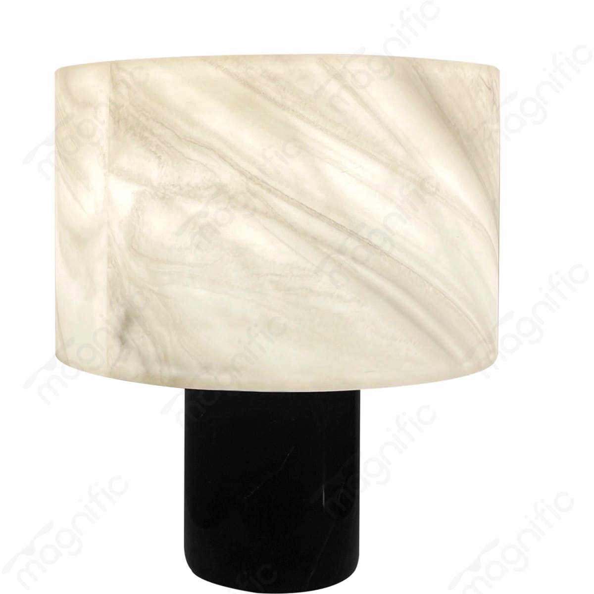 The lamp features a captivating design, where a sleek cylindrical shade rests upon a beautiful marble finish base. The natural veining of the marble finish adds a unique touch to each lamp, making it a one-of-a-kind piece. This lamp transcends mere functionality, becoming a conversation starter with its artistic design and luxurious materials.