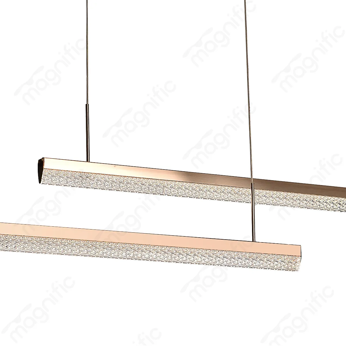 The Magnific linear Hanging light offers a contemporary and architecturally inspired lighting solution. Multiple slender, illuminated bars are suspended at varying lengths from a single rectangular canopy, creating a dynamic and layered visual effect.