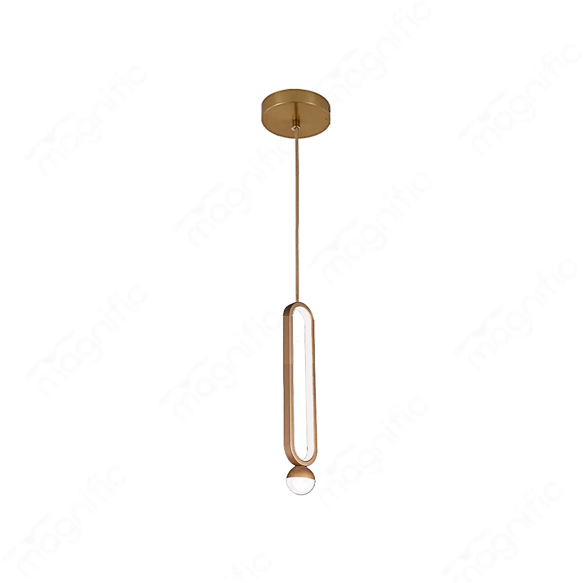The Magnific Lighting pendant light offers a perfect blend of modern design and sophisticated illumination. Its sleek, elongated oval loop in a luxurious Champaign Gold finish suspends a gently glowing spherical diffuser. The integrated 21W LED offers adjustable color temperatures , allowing you to customize the lighting ambiance to perfectly suit your mood or the time of day.