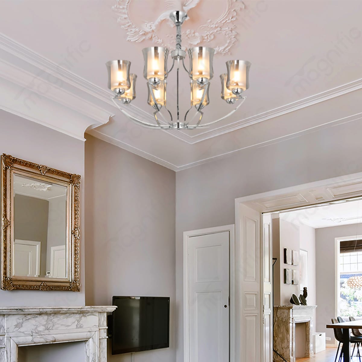 Illuminate your space in style with the Modern Chrome chandelier. This fixture utilizes multiple E27 bulbs , allowing you to customize the lighting according to your needs. Choose a bright bulb for ample illumination in your dining room, or a dimmer bulb for a more warm and inviting ambiance in your living room or entryway.