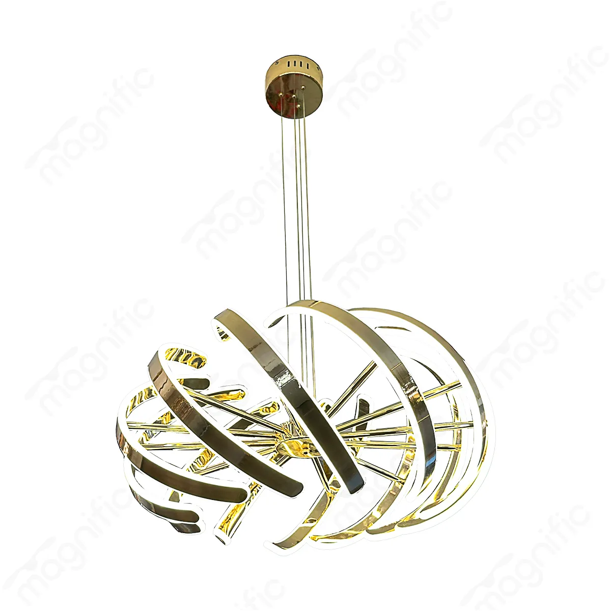 The Magnific Hanging chandelier offers a contemporary design with swirling, luminous rings in a French Gold finish, providing a unique and artistic illumination for modern living spaces.