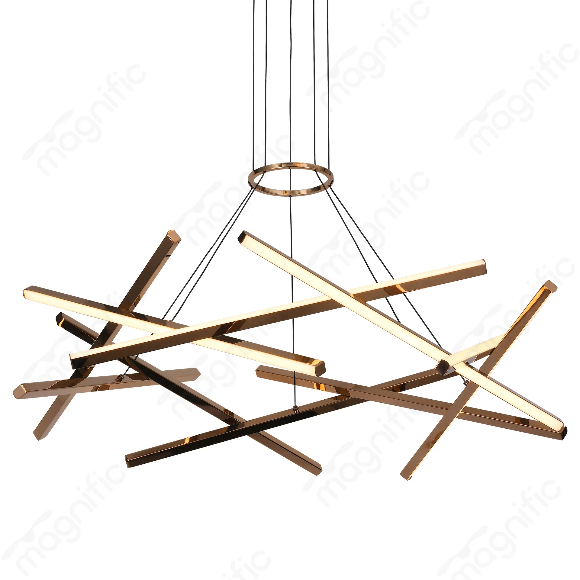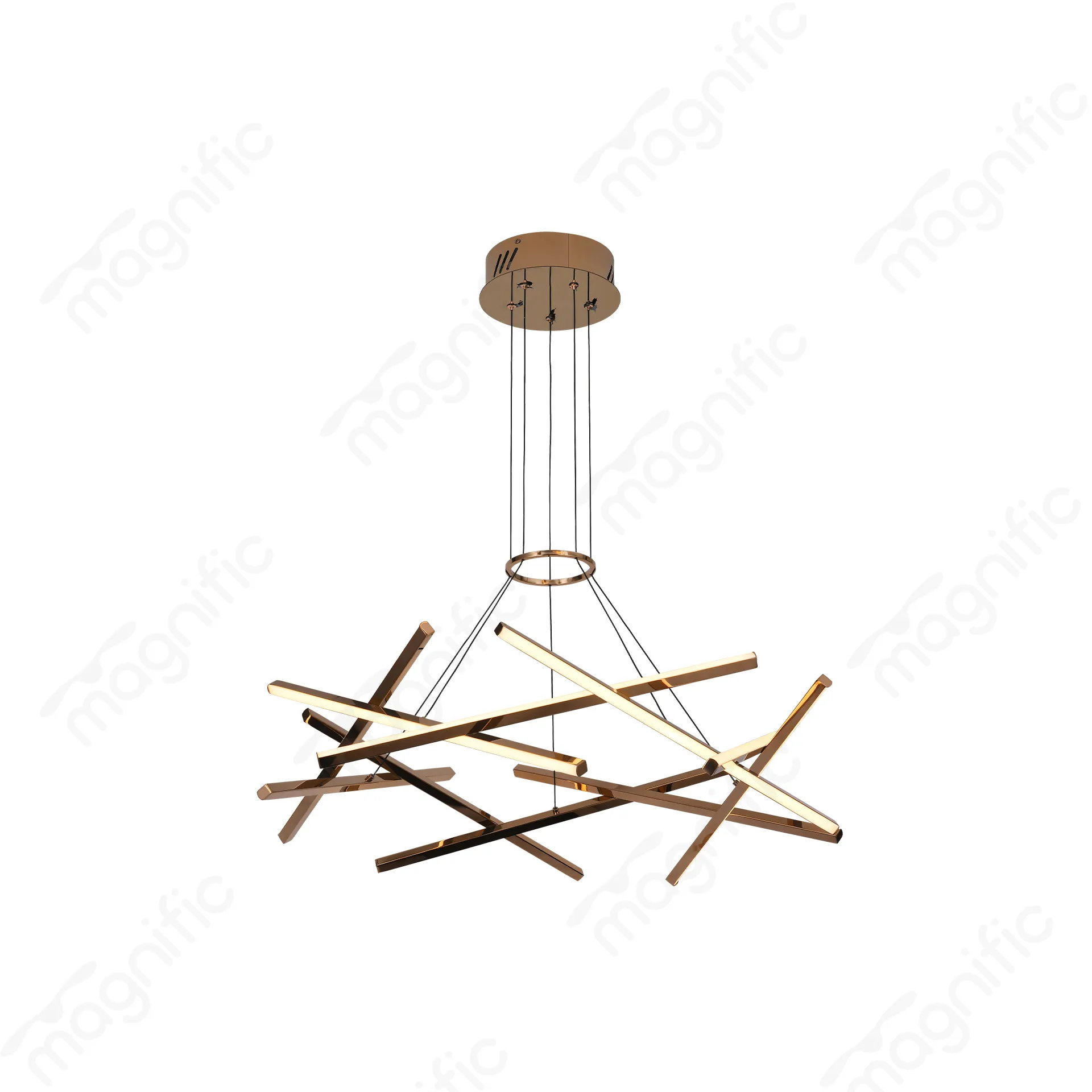 The unique circular design and intersecting linear elements create a visually striking and artistic piece. The rose gold finish adds a touch of luxury and sophistication, while the adjustable LED lighting offers ample brightness for various tasks. The large size makes it a perfect focal point for any room.