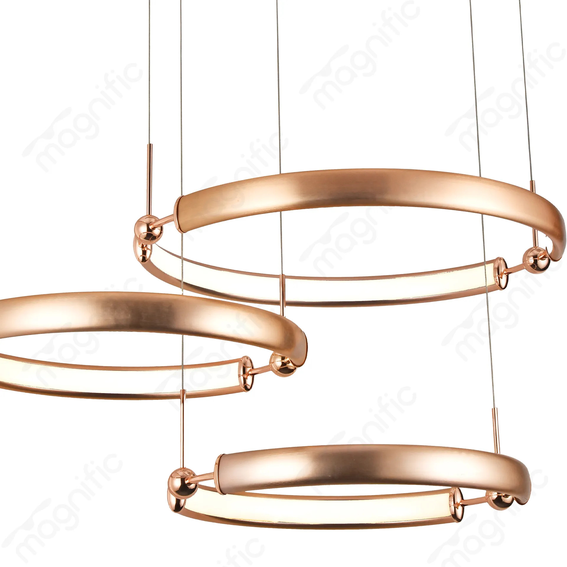 The Modern Multi-Ring LED Chandelier. This brushed gold masterpiece features three circular LED rings, offering a warm 3000K glow. Ideal for both residential and commercial interiors, it adds a touch of elegance and modernity to any room.