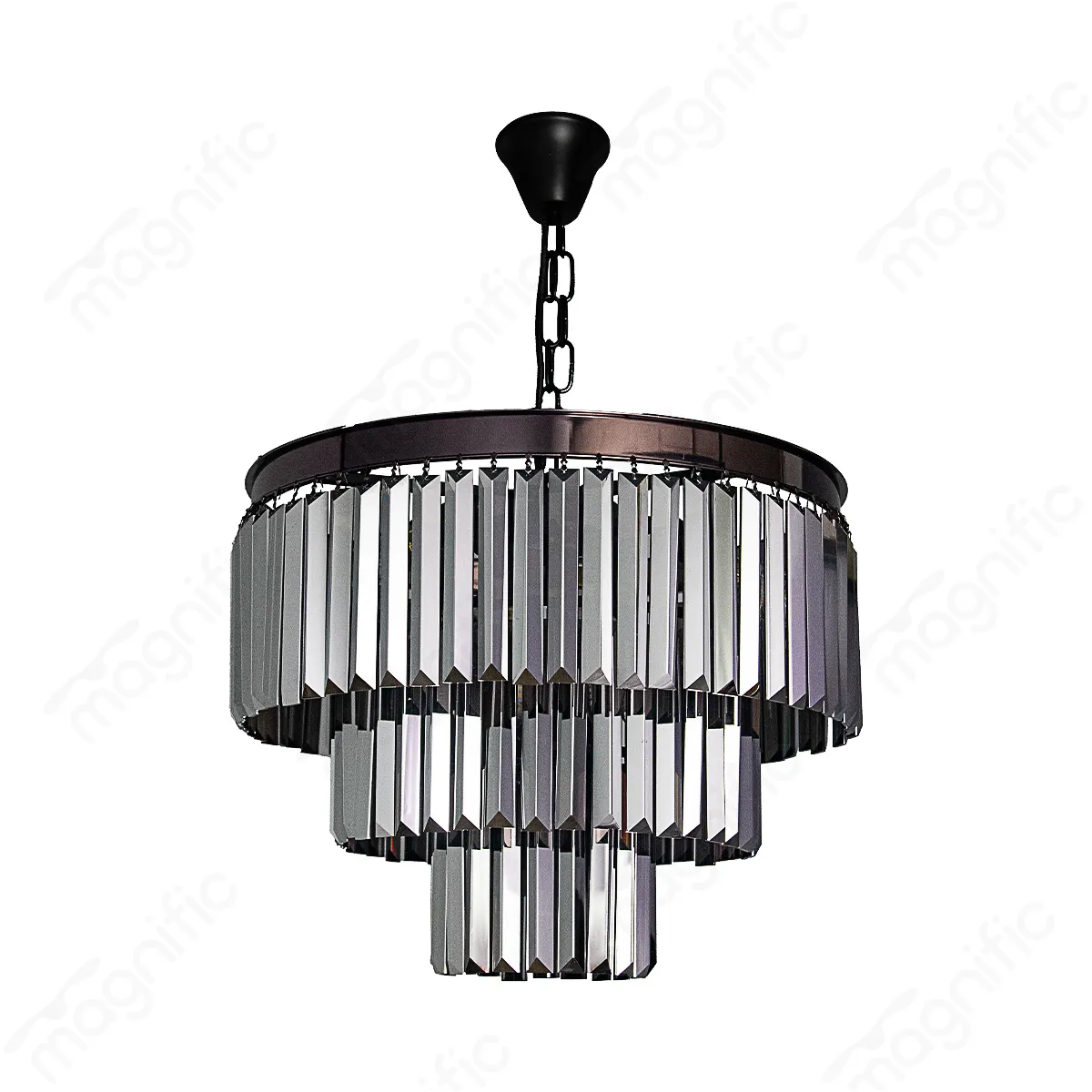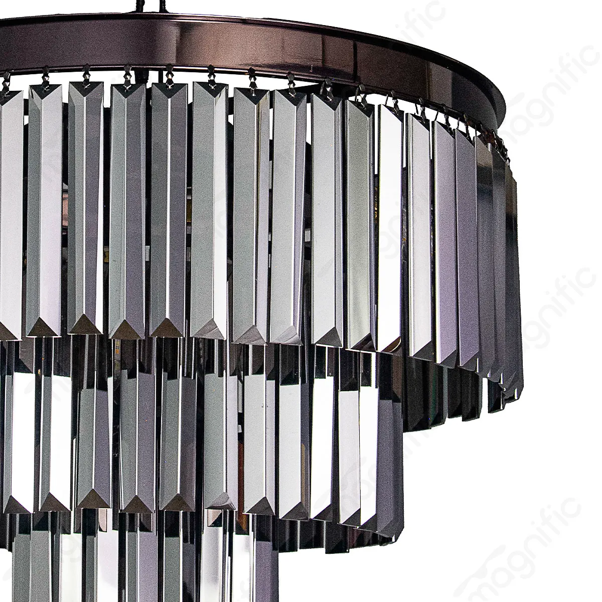 Its three-tiered structure draped in smoke glass makes it a perfect statement piece. Ideal for upscale residential or hospitality settings, this lighting fixture combines form, function, and fashion in one breathtaking design.