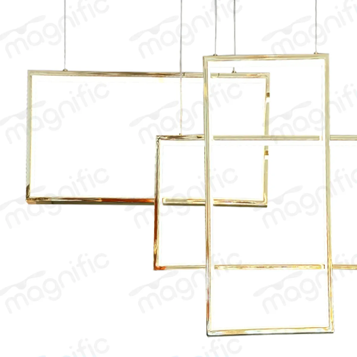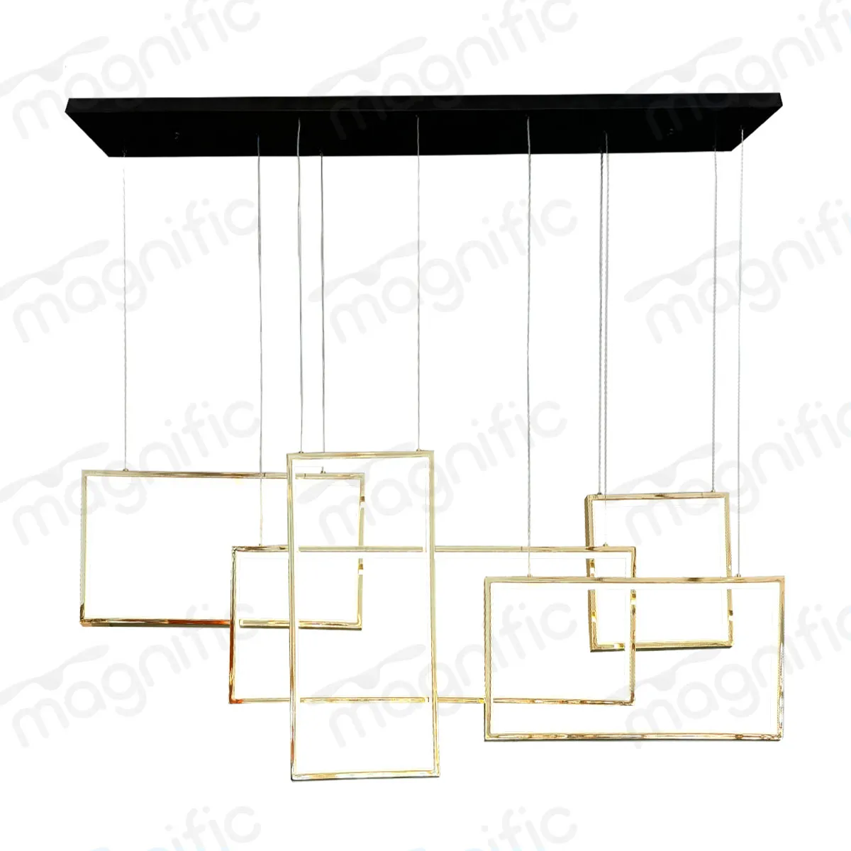 An architectural composition of light and geometry. Five interlocking rectangular frames in lustrous French gold finish create a floating sculpture that transforms overhead space into modern art. Designed for discerning interiors where bold design meets sophisticated illumination.