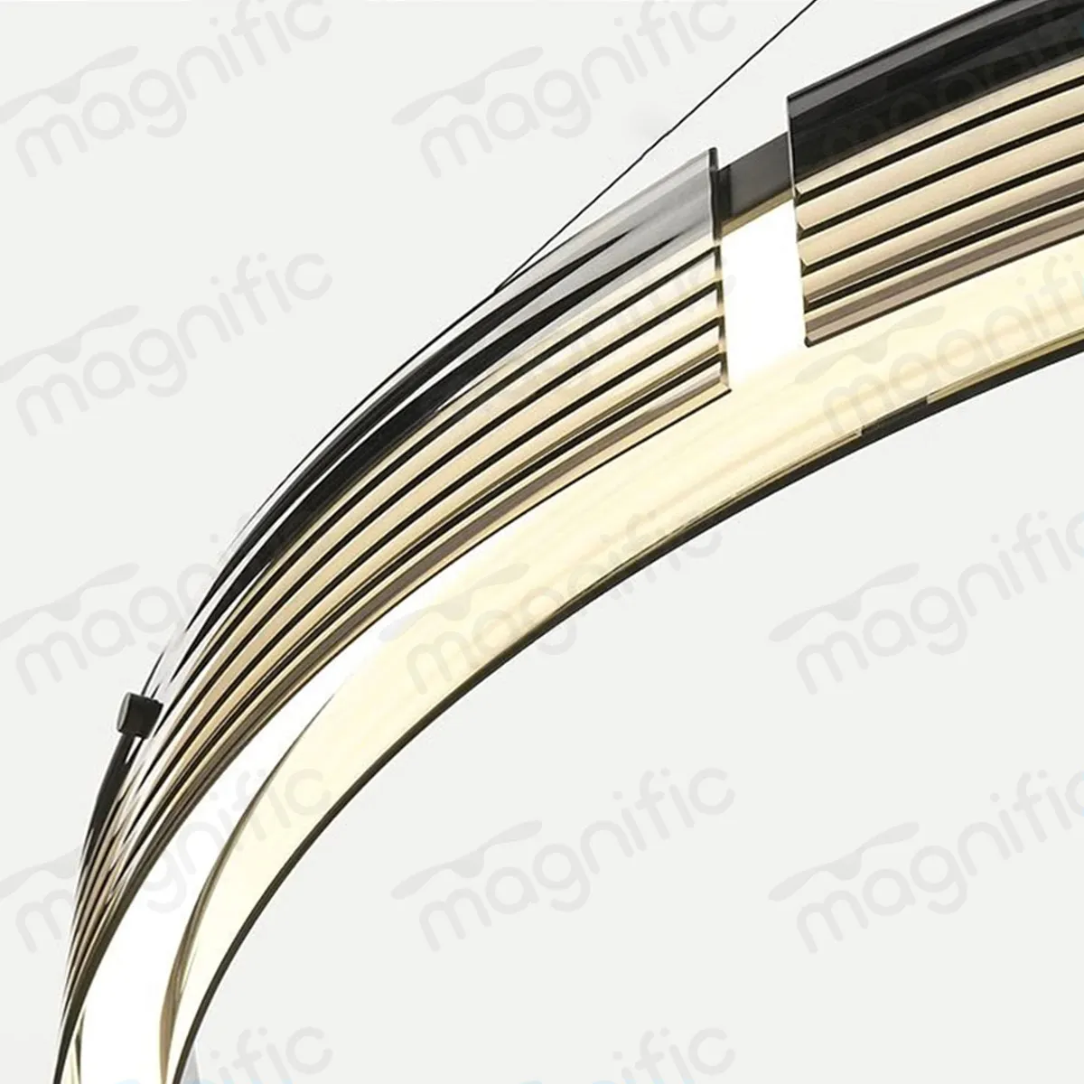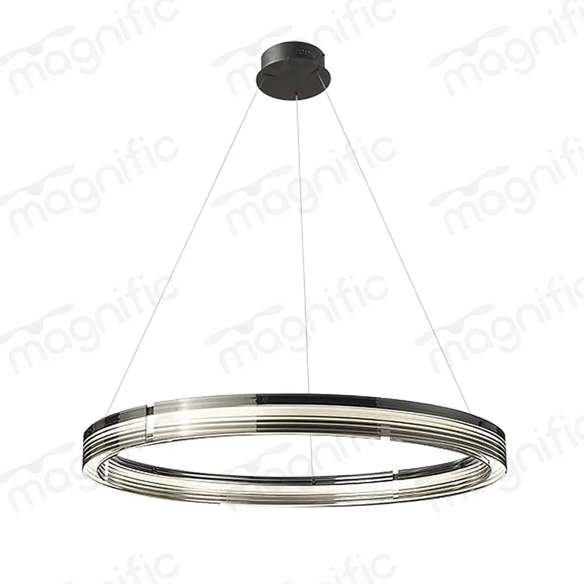 The Orbit distils the ring chandelier to its most architecturally precise form a single 600mm halo of ribbed smoky grey metalwork, suspended on tensioned wires from a dark ceiling canopy, its inner channel glowing with 100W of integrated LED light in your chosen color temperature. Where crystal chandeliers announce themselves with sparkle and ornament, the Orbit announces itself with restraint the confidence of a fixture that knows exactly what it is, and does it without excess.