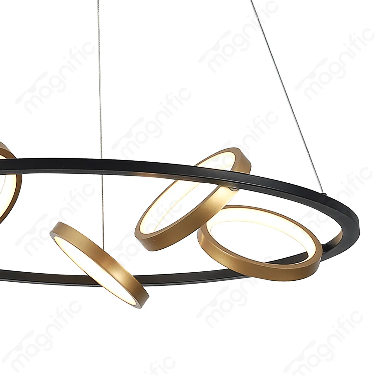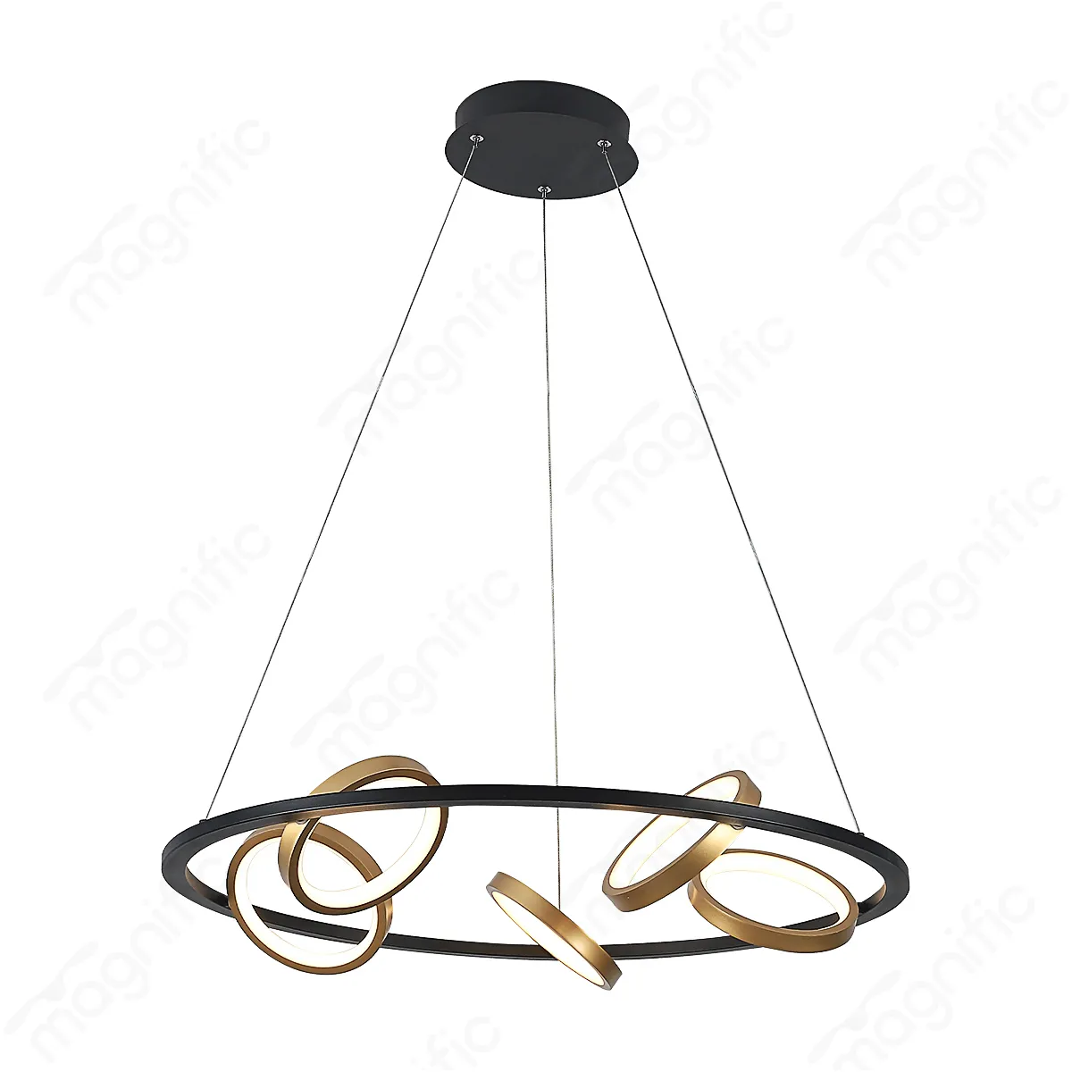 This Magnific Lighting chandelier presents a captivating display of modern artistry with its abstract and dynamically intertwined elliptical rings. A sleek black outer frame provides a striking contrast to the flowing inner rings finished in a luxurious gold.
