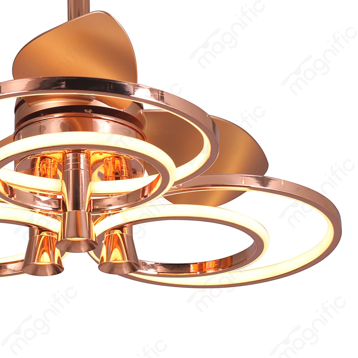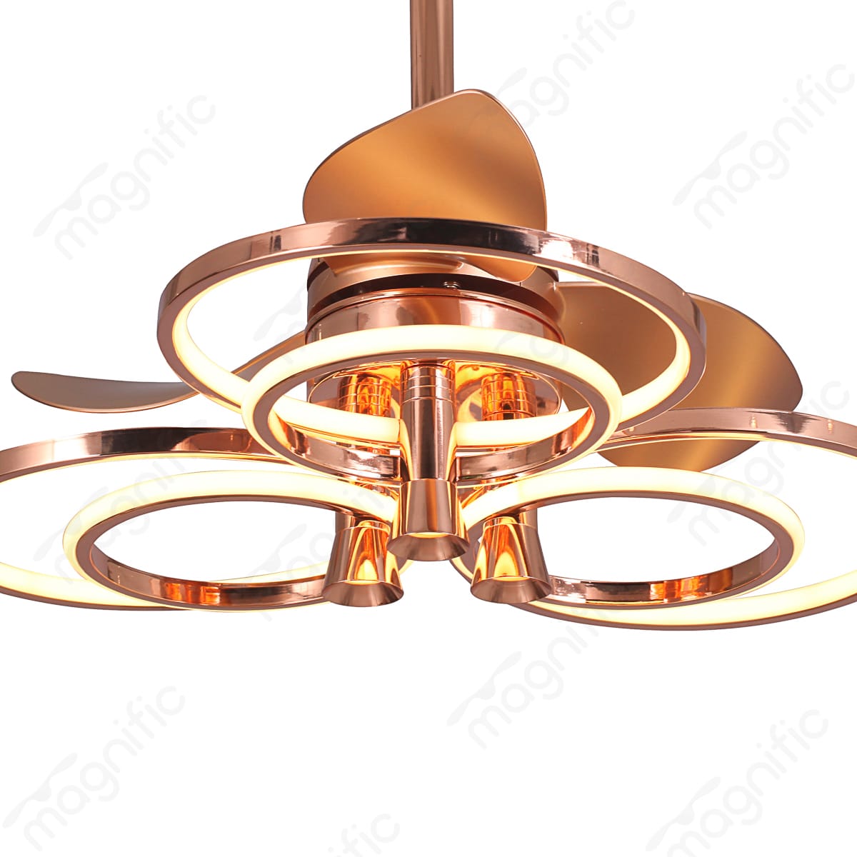 Introducing Magnific Rosy, where Ultra Modern Contemporary meets Fandelier Fan design. Ideal for foyer, dining, and living rooms, Rosy captivates with its exquisite Rosegold and French Gold finish. Rosy redefines elegance with its fusion of a fan and chandelier. This enchanting 24-inch fandelier showcases an intricate design, casting a captivating glow in your space. Available in luxurious Frenchgold or Rosegold finishes, it boasts sleek blades and beautiful LEDs transforming into a radiant light fixture. With a 100-watt LED light offering three color temperatures , you can set the perfect mood. Enjoy powerful, quiet airflow , a summer/winter option for year-round use, and convenient 6-speed remote control with a timer.