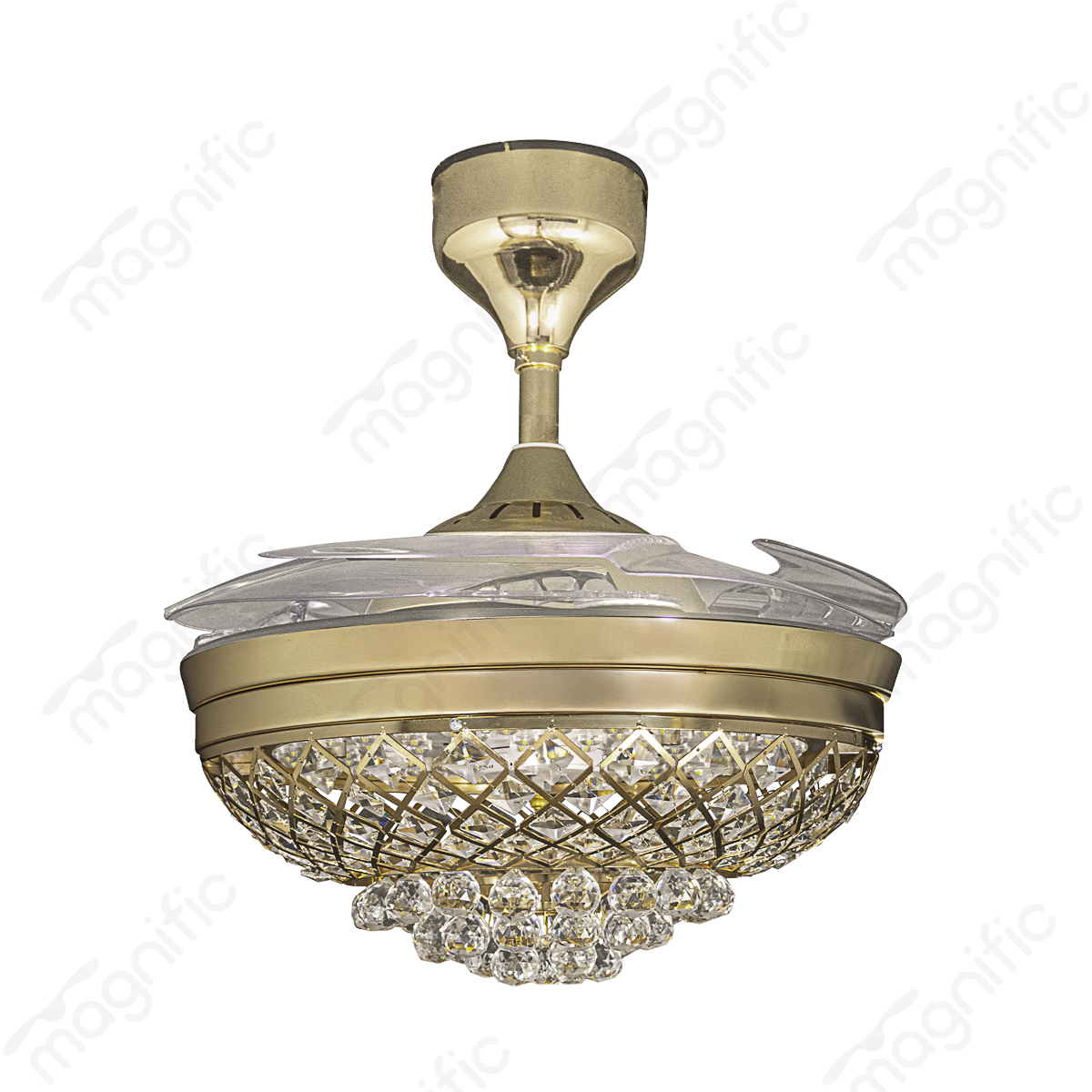 The Magnific Ruby ceiling fan embodies sophistication and modern design with exceptional functionality. This beautiful fan features captivating transparent ABS blades that beautifully complement the luxurious French gold finish.