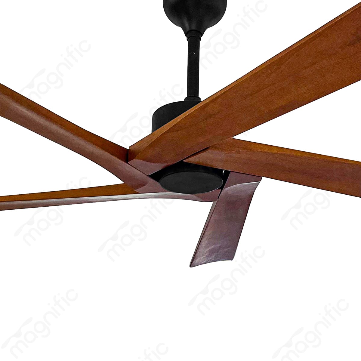 The Magnific Stallion ceiling fan is a stunning fusion of style and performance. Its minimalist design and powerful motor create a serene atmosphere in any room. The sleek matte black finish adds a touch of sophistication, while the dark wooden blades provide a warm contrast.