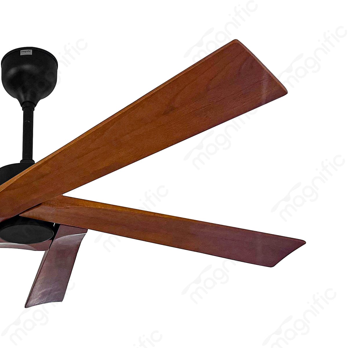 The Magnific Stallion Ceiling Fan, a perfect fusion of contemporary design and exceptional performance. This ceiling fan boasts a sleek matte black body and five durable wooden blades that deliver a refreshing breeze while enhancing your home’s aesthetic appeal.