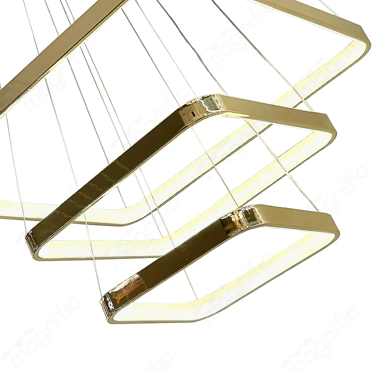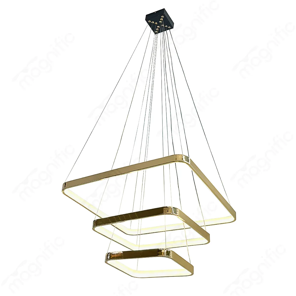 Magnific Chandelier redefines luxury with its layered square-ring design and rich French Gold finish. Ideal for modern and minimalist interiors, this 3-tier chandelier suits high ceilings in living rooms, dining areas, or hallways. The LED offers 3000K, 4000K, and 6000K color temperatures, giving you complete control over ambience.