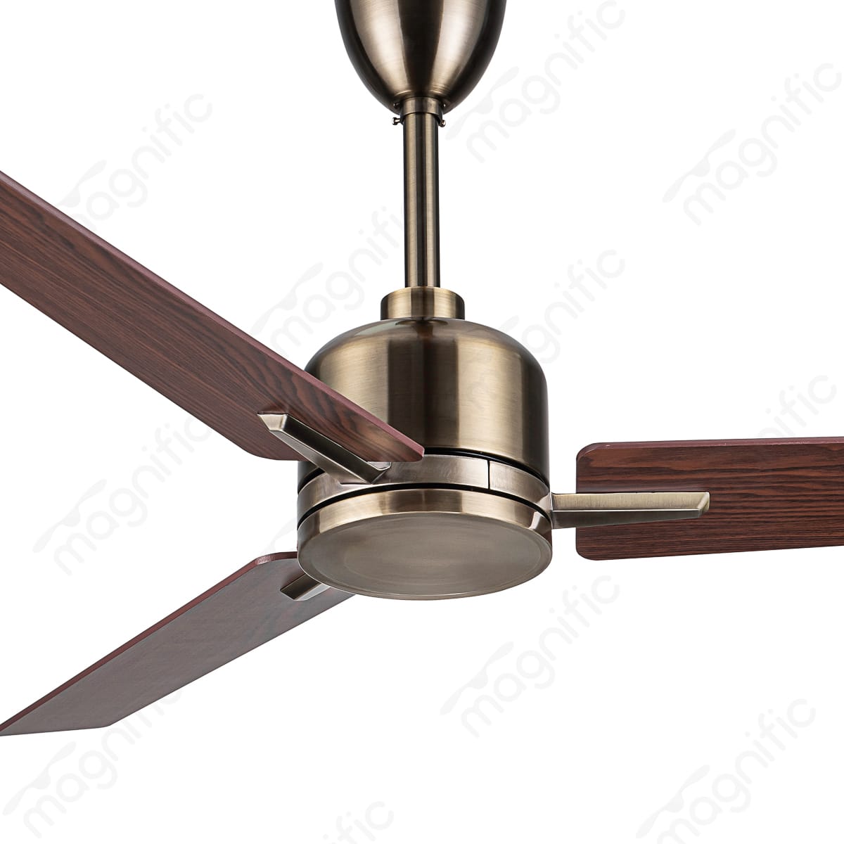 The Swan ceiling fan from Magnific Designer Fans offers a timeless blend of classic design and modern technology. With its rich antique brass finish and distinctive walnut special wooden blades, this 52-inch fan adds a touch of sophistication and warmth to any living space.