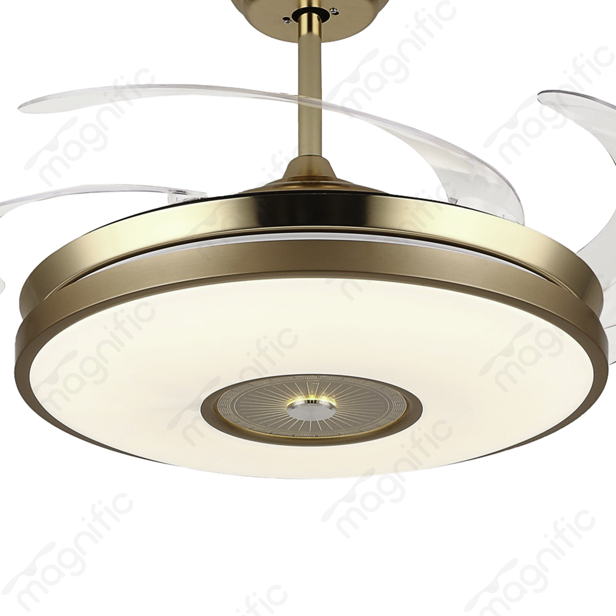The Magnific Zinnia Ceiling Fan, This innovative design boasts transparent retractable blades that disappear when not in use. The French gold finish complements any décor, while the powerful motor ensures optimal airflow. Integrated LED lighting offers customizable ambiance, all controlled effortlessly via remote.
